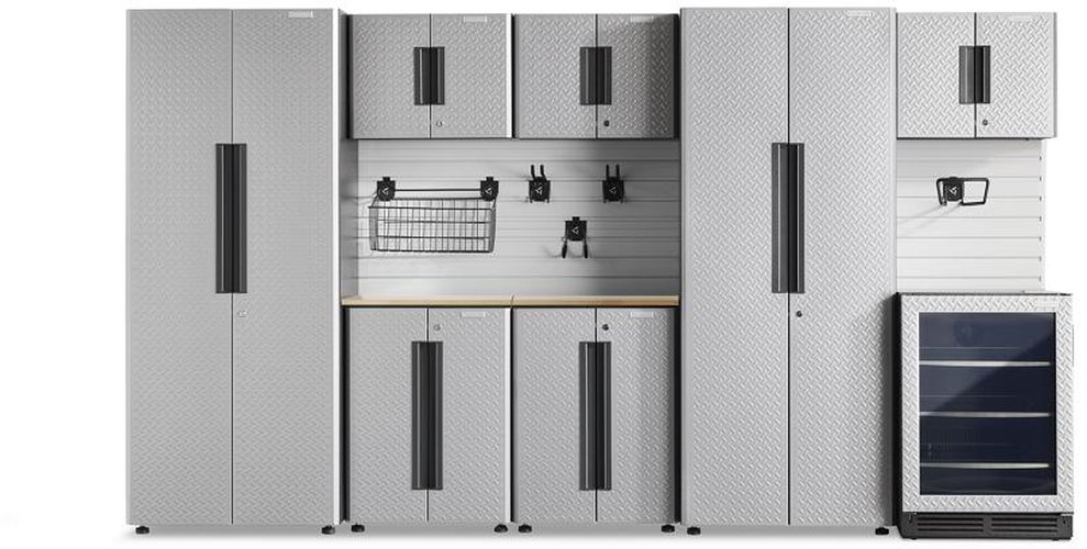 The solid hardwood top is treated with a UV-cured protective coating to protect the garage cabinet sets.