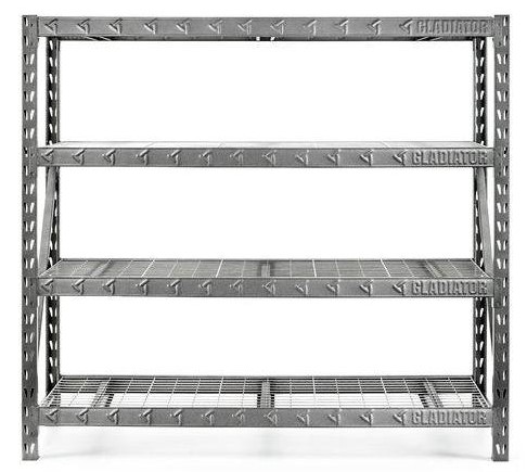 Store large and bulky items on the Gladiator® Rack Shelving unit. This storage unit is fast and easy to assemble at home, and does not require tools. The welded steel frame features four metal shelves that can support up to 2,000 lbs. (907.2 kg) each, and the dual slot profile allows for additional supports and shelves.Read More